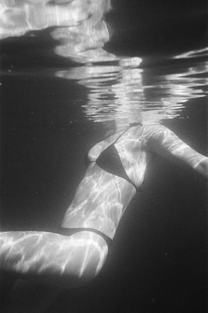 black and white woman floating in a lake. 35 mm underwater film. shot in the lake tahoe area, california.
