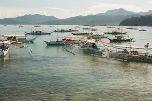 eco-tourism boats moored near puerto princesa. 35 mm film. shot in palawan, philippines.